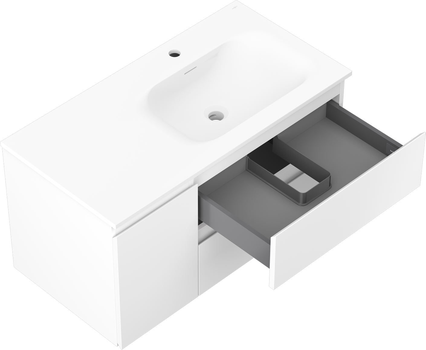 El corte en el cajón está diseñado de tal manera que pueda alojar el sifón, que es necesario en las instalaciones de lavabos. Gracias a esto, el mueble puede ser montado de manera completamente funcional, sin la necesidad de renunciar al espacio en el cajón en favor de la instalación.