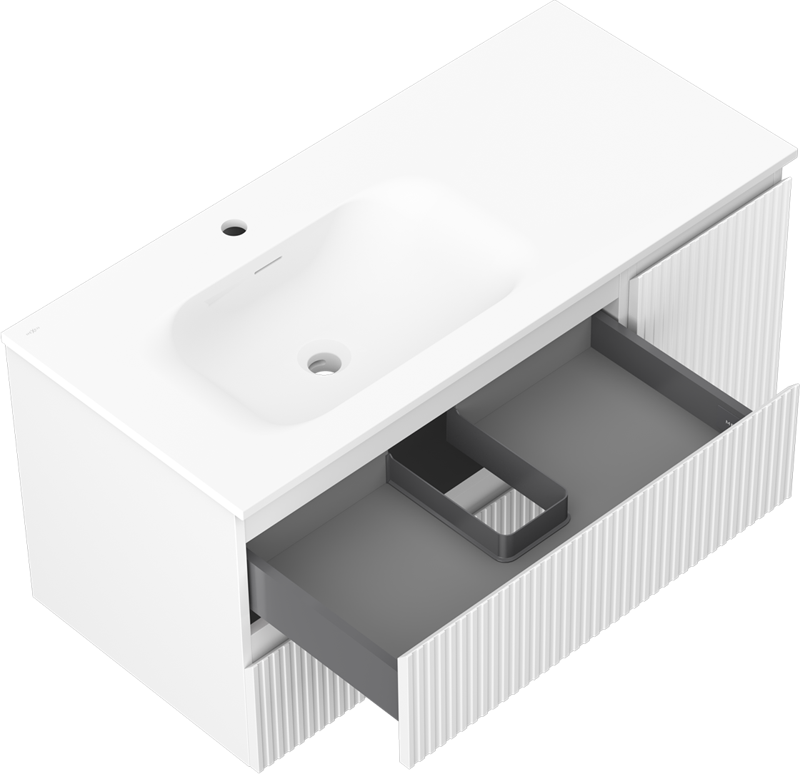 El corte en el cajón está diseñado de tal manera que pueda alojar el sifón, que es necesario en las instalaciones de lavabos. Gracias a esto, el mueble puede ser montado de manera completamente funcional, sin la necesidad de renunciar al espacio en el cajón en favor de la instalación.