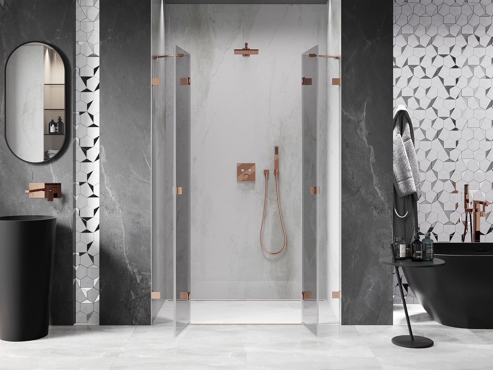 Las abrazaderas y bisagras están hechas de latón muy duradero, y además crean una superficie de vidrio al ras. Es una excelente opción que combina elegancia, durabilidad y diseño moderno. Gracias a tales soluciones, la ducha gana en estética y, al mismo tiempo, facilitan el mantenimiento de la limpieza.