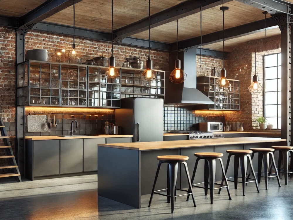 - Qué elementos de decoración crean un ambiente característico tipo loft en la cocina.