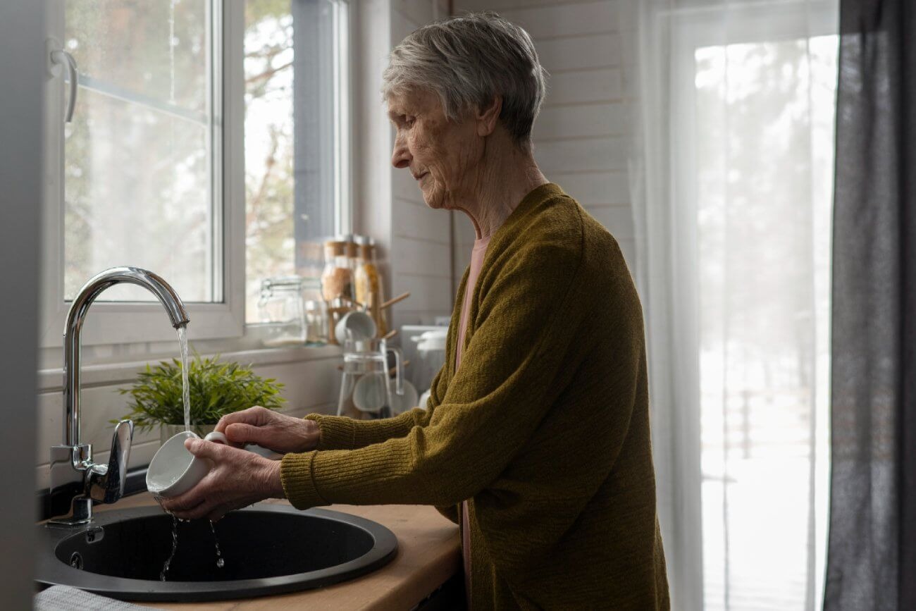 - Riesgo de salpicaduras en los cristales y el alféizar – al lavar los platos, especialmente los más grandes, existe el riesgo de salpicar la ventana, el alféizar y los marcos de la ventana con agua. La humedad puede conducir a daños mecánicos, como deformaciones del alféizar o corrosión de los marcos de la ventana, particularmente si están hechos de madera. Por eso es importante proteger adecuadamente estos elementos, por ejemplo, mediante el uso de materiales resistentes a la humedad o su mantenimiento regular.
