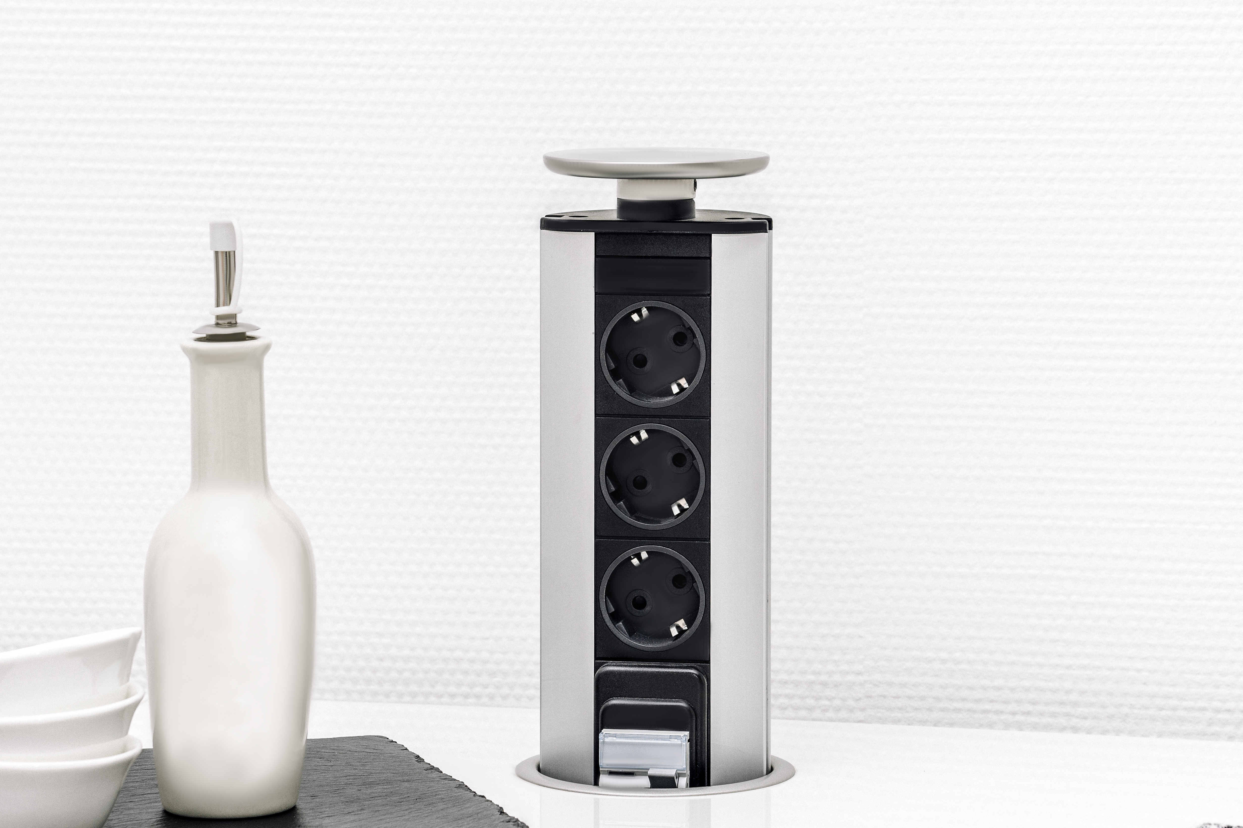 Hoy en día, surgen métodos completamente nuevos que permiten ubicar un enchufe eléctrico de manera que sea lo menos visible posible. Además, a un solo enchufe se pueden conectar varios otros que, por ejemplo, estén empotrados en la encimera y se saquen solo cuando sean necesarios. Los enchufes eléctricos integrados en el área de trabajo prácticamente no ocupan espacio, y además no están expuestos a riesgo de derrame o suciedad durante la preparación de alimentos.
