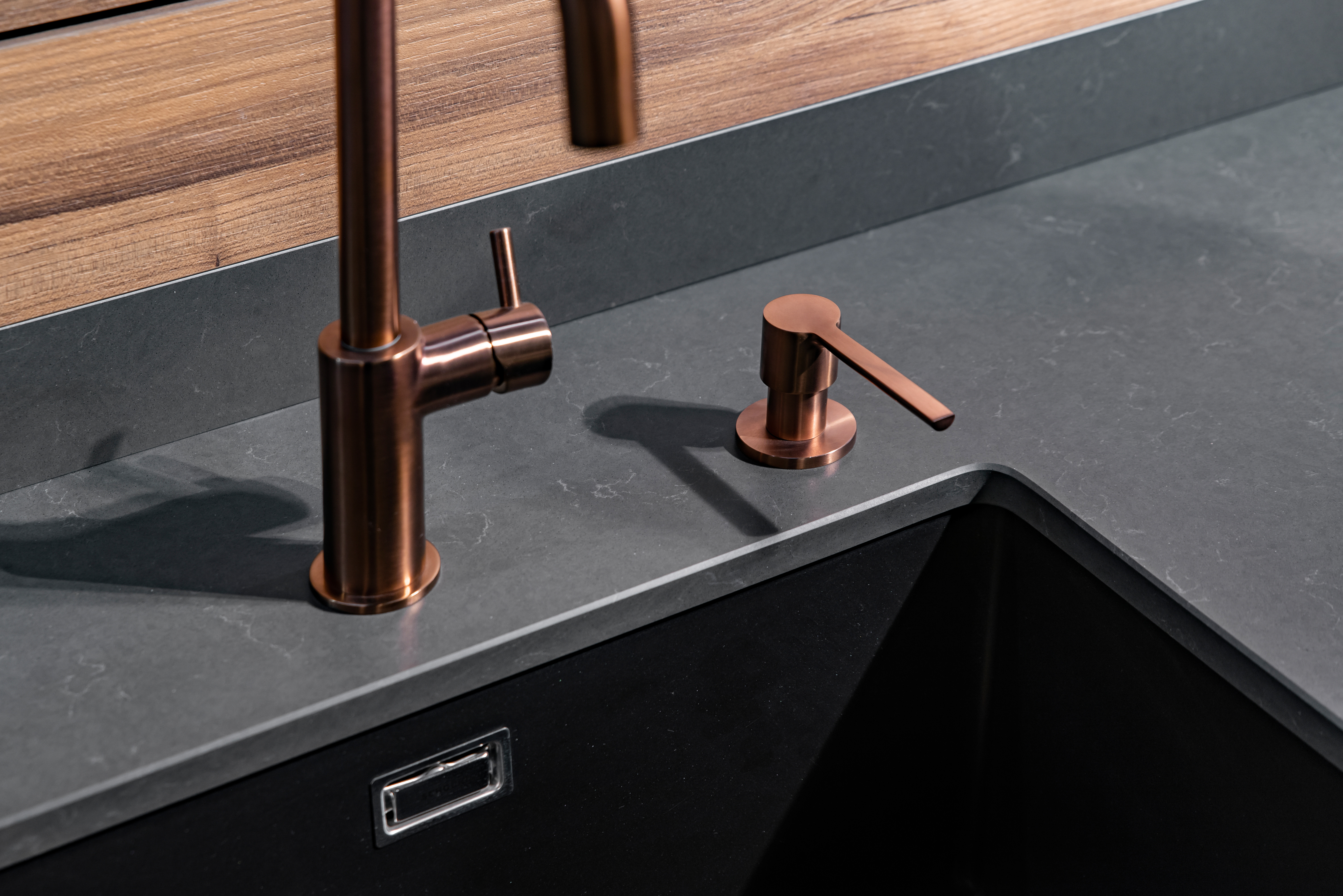Si buscas soluciones modernas que ayuden a mantener la limpieza en tu cocina, presta especial atención a los dispensadores de plástico incluidos con el fregadero. Una pequeña botella con un grifo con bomba se monta en el borde del fregadero, justo antes del escurridor. De esta manera, tienes acceso al detergente para platos que siempre está a mano.