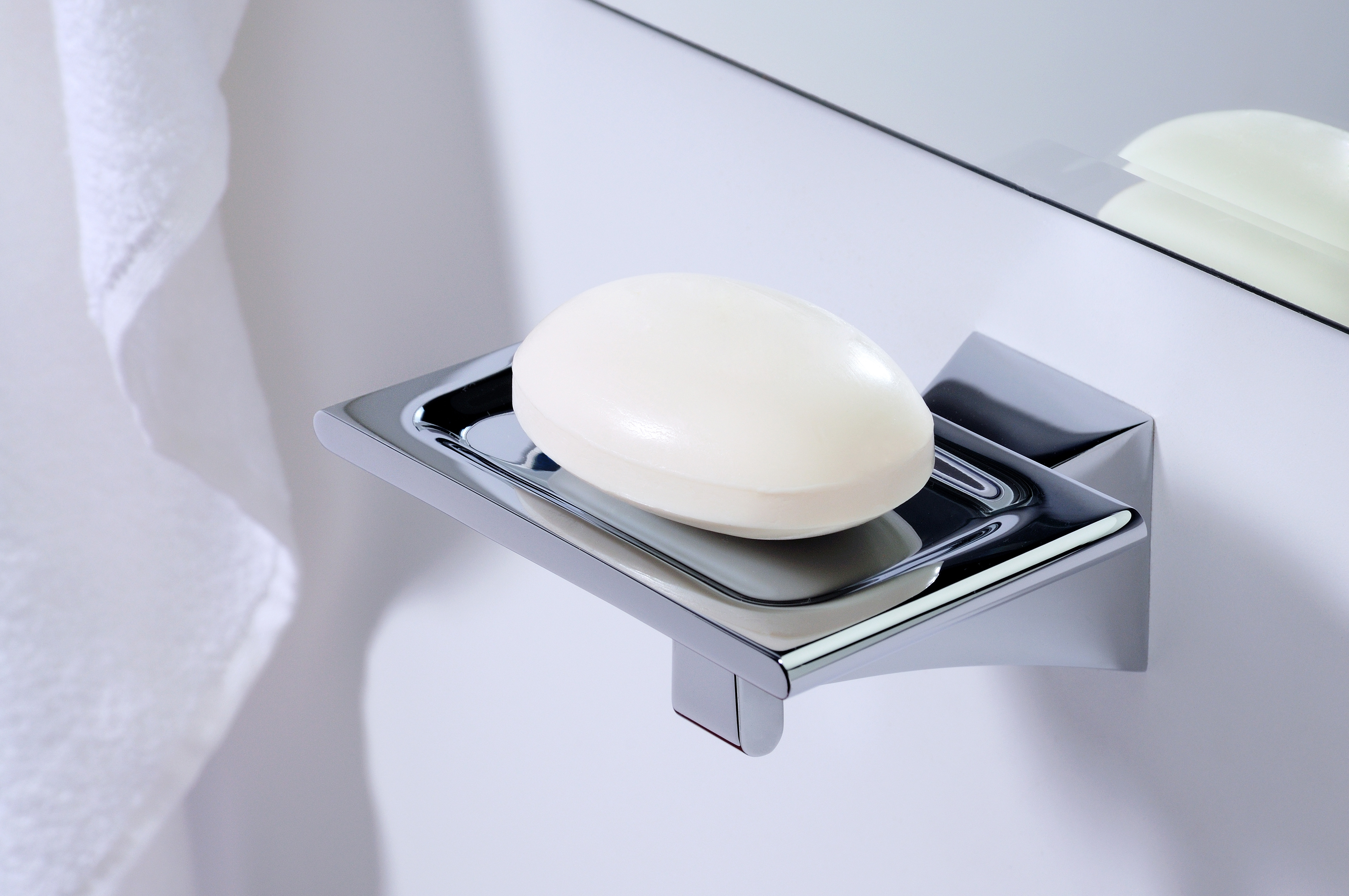 Una solución interesante son las jaboneras con soporte magnético, montadas directamente en la pared. Al jabón se le adhiere una placa metálica especial. Gracias al imán, el jabón siempre está en su lugar.