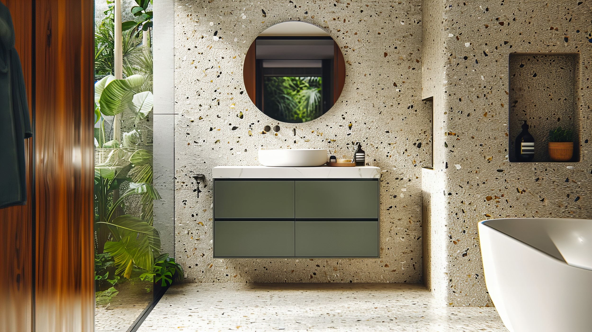 - Madera — los granos irregulares visibles, por ejemplo, en encimeras de baño,muebles de baño, o baldosas, se combinan perfectamente con el diseño irregular del terrazo.