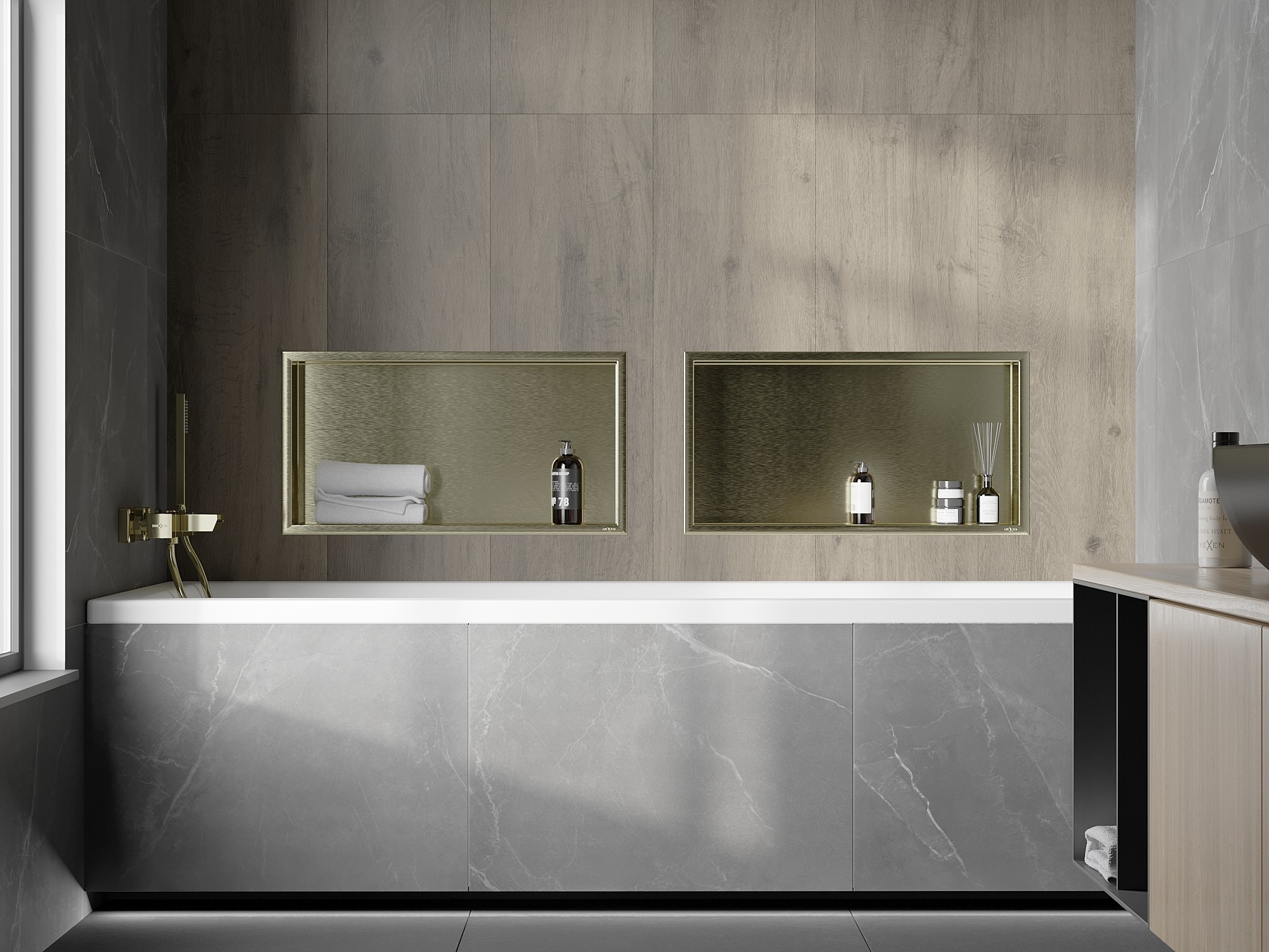 Las soluciones universales son características de todos los baños prácticos. Los estantes junto a la bañera combinan bien con el resto del interior y se destacan por su alta funcionalidad. Permiten tener a mano tus cosméticos favoritos en cualquier momento durante el baño. Algunos estantes empotrados parecen armarios abiertos, y precisamente estas soluciones son las que encontrarás principalmente en nuestra oferta. A continuación, presentamos inspiraciones que merece la pena seguir al diseñar estantes empotrados en el baño.