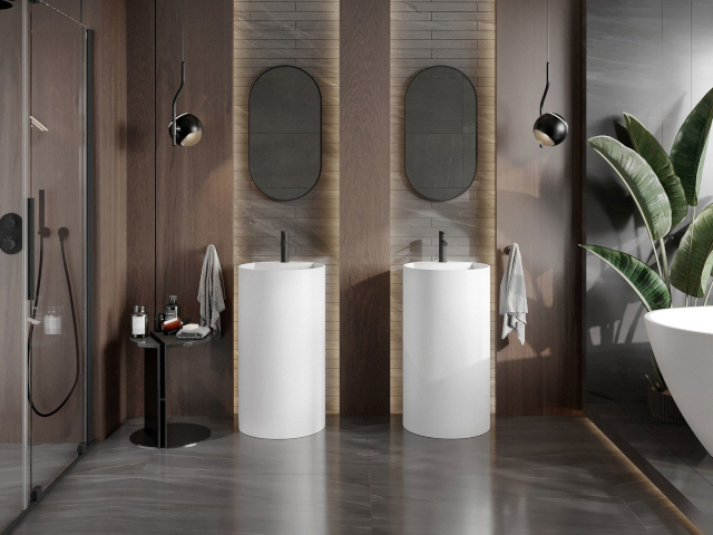 La superficie uniforme del frente organiza la composición de la pared, dirige la mirada hacia arriba y evita crear una sensación de sobrecarga. Esto es lo que distingue la estantería de columna y le da ventaja sobre los muebles tradicionales. La columna de baño colgante aprovecha el potencial espacial del baño y permite aligerar visualmente el espacio, lo cual es una ventaja clara de esta solución. La columna de baño también une las zonas de uso en una unidad coherente, que parece hecha a medida. Obviamente, siempre que elijas un mueble de lavabo de la misma colección.